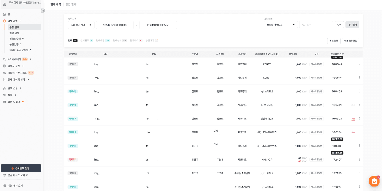 - 결제대행사 필터는 하나의 결제대행사에 모든 pg_provider가 포함됩니다.