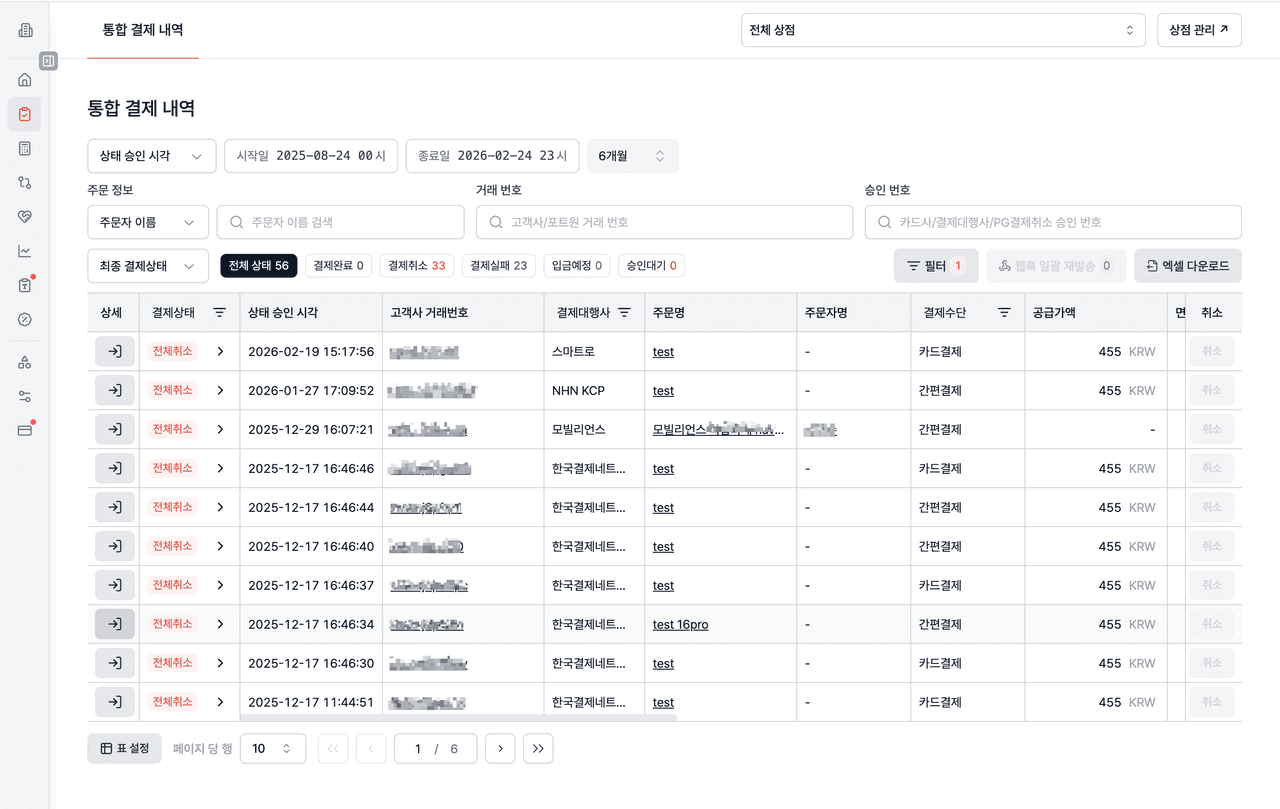 - 취소 사유 : 결제 취소 건에 한하여 취소 사유 데이터 중 입력한 텍스트와 일치하는 데이터가 표시됩니다. 포트원 어드민콘솔에서 취소한 경우 취소 사유는 관리자페이지취소로 일괄 입력됩니다.